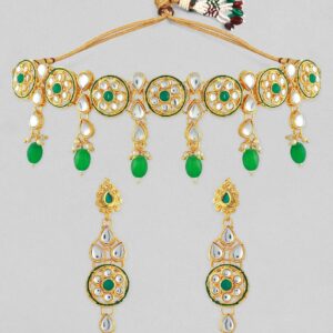 22K Gold-Plated Green & White Beaded Kundan Studded Choker Jewellery Set – Gold