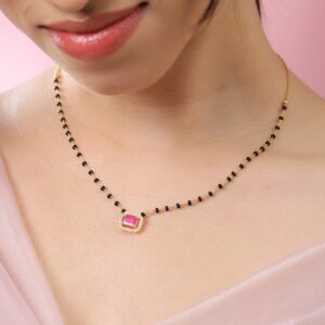 22K Gold-Plated Ruby Pink & Cubic Zirconia Stone Studded Mangalsutra with Black Beaded Chain – ruby