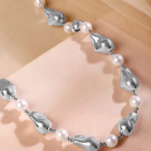 Rhodium Plated Handcrafted Sculptural Necklace with White Pearls & Silver Accents – Silver