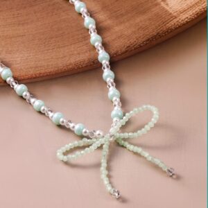 Rhodium Plated Aqua Green & White Beaded Necklace with Mint Green Bow Pendant – Silver