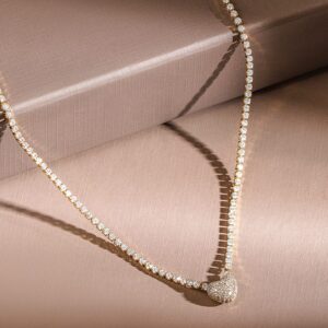 22K Gold Plated Crystal Cubic Zirconia Luxe Tennis Necklace with Pav? Heart Pendant – Gold