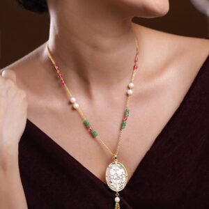18K Gold-Plated Ruby Pink & Emerald Green Kundan Studded Necklace with Pearl Accents