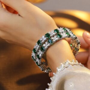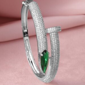 Rhodium-Plated Emerald & Cubic Zirconia Studded Bangle Style Bracelet – Silver