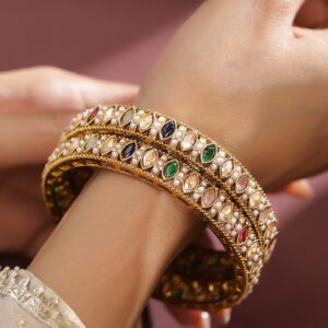 Set of 2, 22K Gold Plated Kundan & CZ Studded & Pearl Beaded Handcrafted Bangles – 2.4
