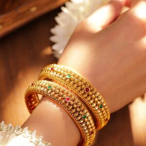 Set of 2 24K Gold-Plated Ruby Red & Emerald Green Studded Golden Beaded Bangles – 2.8