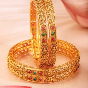 Set of 2 24K Gold-Plated Ruby Red & Green Stone Studded Temple Bangles with Lakshmi Motif – 2.4