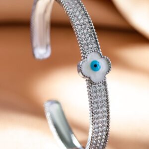 Rhodium-Plated Evil Eye Cuff Bracelet with Cubic Zirconia Detailing – Silver