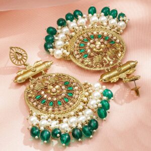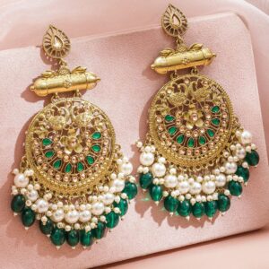 Chandbali Earrings : 18K antique gold-plated chandbalis with peacock motif, emerald green beads, and white pearls, crafted in brass for grand wedding, festive, and party elegance. Occasion Ready: Perfect for weddings, festive celebrations, and cultural events, offering bold style. Material & Care Dimension : Length 11 cm ; Width : 5 cm Net Weight : 56.92 Gram Material : Brass Collection : Pearls & Beads Net Quantity : 1 pair of Earrings Care Label : It is advisable to avoid contact with water and organic chemicals i.e. perfume sprays. Store jewellery in airtight box. After use, wipe the jewellery with soft cotton cloth.