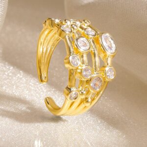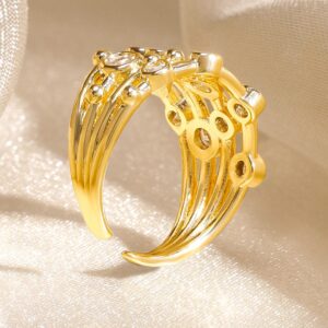 Ring : This 18K gold-plated brass ring features a handcrafted open-structure design with clustered bands interwoven with oval and round AD stones, giving it a fluid and luxe look. Occasion & Styling: Ideal for both casual and dressy looks, this ring effortlessly elevates any outfit—whether it’s a day at work or an evening celebration. Material : & Care Dimension : Ring Size : Adjustable/Openable Ring Material : Brass Net Quantity : 1 Ring Net Weight : 4.1 Gram Care Label : It is advisable to avoid contact with water and organic chemicals i.e. perfume sprays. Store jewellery in airtight box. After use, wipe the jewellery with soft cotton cloth.