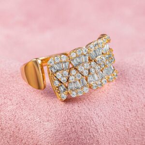 Ring : Discover the elegance of 18K Gold Plated Adjustable Cubic Zirconia Studded Statement Adjustable Finger Ring. This piece combines quality craftsmanship with a timeless design, making it perfect for any occasion. Elevate your style effortlessly and enjoy compliments on your refined taste. A must-have addition to your jewelry collection. Occasion : Bring your style to a whole new level with this handcrafted piece of jewellery. When you’re celebrating a special Occasion : – a birthday, wedding, or personal milestone – this piece adds that extra something that makes us feel special and looking our best. Material : & Care Dimension : Ring Size: 6 Material :Brass Net Quantity: 1 Rings Net Weight – 6 Grams Care Label : It is advisable to avoid contact with water and organic chemicals i.e. perfume sprays. Store jewellery in airtight box. After use, wipe the jewellery with soft cotton cloth.