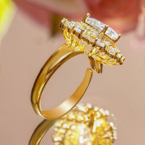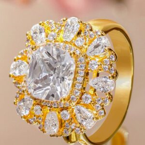 Ring : 18K gold-plated adjustable ring with cushion-cut Cubic Zirconia, framed by pear and round stones in a floral halo design, perfect for weddings, parties, and festive wear. Perfect for Elegant Styling: Whether paired with ethnic or western attire, this statement ring adds glamour and grace, ideal for cocktail events, festive gatherings, and special celebrations. Material : & Care Dimension : Ring Size : Adjustable Ring Material : Brass Net Quantity : 1 Ring Net Weight : 25 Gram Care Label : It is advisable to avoid contact with water and organic chemicals i.e. perfume sprays. Store jewellery in airtight box. After use, wipe the jewellery with soft cotton cloth.