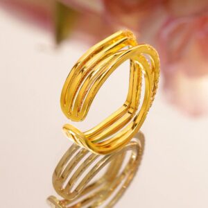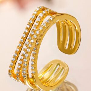 Ring : This 18K gold-plated adjustable ring with triple open rows studded with sparkling crystals, crafted in brass for a modern, elegant look perfect for daily wear or parties. Perfect for Elegant Styling: Whether paired with ethnic or western attire, this statement ring adds glamour and grace, ideal for cocktail events, festive gatherings, and special celebrations. Material : & Care Dimension : Ring Size : Adjustable Ring Material : Brass Net Quantity : 1 Ring Net Weight : 12 Gram Care Label : It is advisable to avoid contact with water and organic chemicals i.e. perfume sprays. Store jewellery in airtight box. After use, wipe the jewellery with soft cotton cloth.