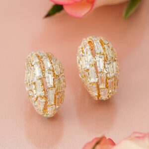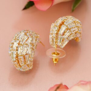 Earrings : These 18K gold-plated earrings feature an oversized half-hoop silhouette encrusted with multiple baguette-cut and round cubic zirconia studs, offering a statement look perfect for festive and party wear. Festive & Party Perfect: These statement earrings are perfect for festive celebrations, receptions, or any high-glam event. Their bold design and full ear coverage make them an elegant choice for upscale occasions. Material : & Care Dimension : Length : 2.5 cm ; Width : 1 cm Net Weight : 18 Gram Material : Brass Net Quantity : 1 Pair of Earrings Care Label : It is advisable to avoid contact with water and organic chemicals i.e. perfume sprays. Store jewellery in airtight box. After use, wipe the jewellery with soft cotton cloth.