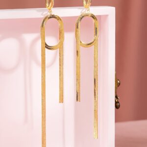 Earrings : Make a statement with these 18K gold-plated shoulder duster earrings, featuring a modern open-loop design with cascading chain detailing. The bold and sleek aesthetic adds glamour to any outfit. Occasion : Bring your style to a whole new level with this handcrafted piece of jewellery. When you’re celebrating a special Occasion : – a birthday, wedding, or personal milestone – this piece adds that extra something that makes us feel special and looking our best. Material : & Care Dimension : Length : 7 cm, Width: 3 cm Net Weight: 32 g Net Quantity : 1 Pair Of Earrings Material :Brass Care Label : It is advisable to avoid contact with water and organic chemicals i.e. perfume sprays. Store jewellery in airtight box. After use, wipe the jewellery with soft cotton cloth.