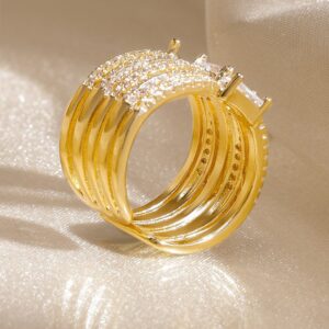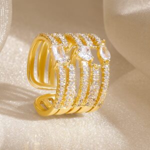 Ring : Crafted in 18K gold-plated brass, this adjustable ring showcases a multi-band caged design studded with radiant cubic zirconia. A bold and luxurious statement for parties and special occasions. Styling Versatility: Elevate your festive and evening wear with this designer-inspired statement ring that complements traditional, Indo-western, and modern looks. Material : & Care Dimension : Ring Size : Adjustable/Openable Ring Material : Brass Net Quantity : 1 Ring Net Weight : 6.9 Gram Care Label : It is advisable to avoid contact with water and organic chemicals i.e. perfume sprays. Store jewellery in airtight box. After use, wipe the jewellery with soft cotton cloth.