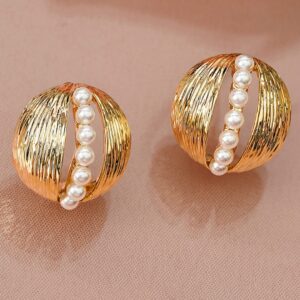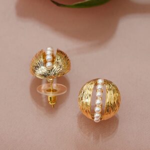 Earrings : These 18K gold-plated dome studs in brass feature ribbed texture and a vertical line of pearls—offering minimal elegance for festive, office, or daily wear, perfect for women & girls. Elegant Gifting Option: A thoughtful gift for birthdays, anniversaries, Raksha Bandhan, or festive occasions—these studs blend modern charm with timeless grace. Material : & Care Dimension : Length : 4 cm ; Width : 2 cm Net Weight : 15 Gram Material : Brass Net Quantity : 1 Pair of Earrings Care Label : It is advisable to avoid contact with water and organic chemicals i.e. perfume sprays. Store jewellery in airtight box. After use, wipe the jewellery with soft cotton cloth.