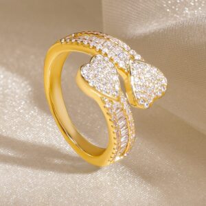 Ring : This romantic 18K gold-plated brass ring features two heart motifs studded with high-shine cubic zirconia and an open adjustable band. A luxurious blend of sparkle and sentiment, perfect for parties, dinners, and gifting. Versatile Statement Ring: Whether worn solo or stacked, this ring makes a meaningful style statement, perfect for romantic evenings and special celebrations. Material : & Care Dimension : Net Weight: 4.7 Gram Net Quantity : 1 Ring Material : Brass Type : Adjustable Ring Care Label : It is advisable to avoid contact with water and organic chemicals i.e. perfume sprays. Store jewellery in airtight box. After use, wipe the jewellery with soft cotton cloth.