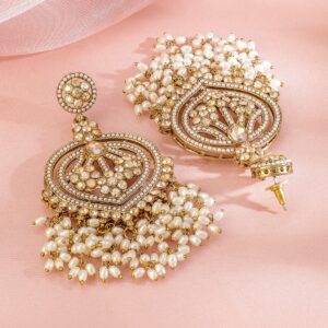 Earrings : Exquisite 18K gold-plated chandbali earrings adorned with champagne Kundan stones and pearl beads. The intricate detailing and grand design make these a perfect pick for festive & bridal occasions. Occasion : Bring your style to a whole new level with this handcrafted piece of jewellery. When you’re celebrating a special Occasion : – a birthday, wedding, or personal milestone – this piece adds that extra something that makes us feel special and looking our best. Material : & Care Dimension : Net Weight: 43.89 G Net Quantity : 1 Pair of Earrings Material :Brass Care Label : It is advisable to avoid contact with water and organic chemicals i.e. perfume sprays. Store jewellery in airtight box. After use, wipe the jewellery with soft cotton cloth.