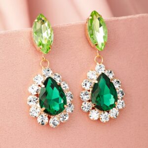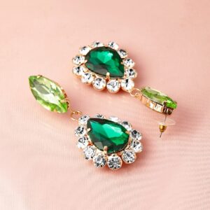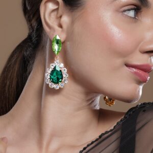 These 18K gold plated earrings feature a stunning dark green teardrop zirconia, surrounded by clear accents, paired with a light green marquise stone. Elegant and eye-catching, perfect for adding a touch of luxury to any outfit. Material: Wipe with a clean, dry cloth to remove dust Size : Length : 7 cm, Width : 3 cm