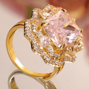 Ring : 18K gold-plated adjustable ring with crystal pink centre stone, floral halo design, and sparkling white cubic zirconia detailing. Perfect for wedding, festive, party & cocktail wear. Perfect for Elegant Styling: Whether paired with ethnic or western attire, this statement ring adds glamour and grace, ideal for cocktail events, festive gatherings, and special celebrations. Material : & Care Dimension : Ring Size : Adjustable Ring Material : Brass Net Quantity : 1 Ring Net Weight : 27 Gram Care Label : It is advisable to avoid contact with water and organic chemicals i.e. perfume sprays. Store jewellery in airtight box. After use, wipe the jewellery with soft cotton cloth.