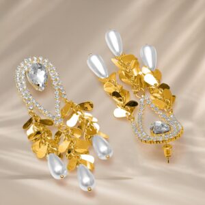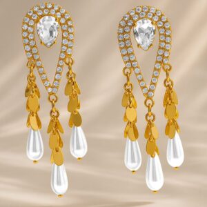 Earrings : 18K gold-plated brass tassel drop earrings with crystal white cubic zirconia and layered pearl hangings, perfect for birthday, festive occasions, and special celebrations. Occasion Perfect: Ideal for cocktail, receptions, festive gatherings, and any party looks, adding glamour to any outfit. Material & Care Dimension : Length: 7 cm Dimension : Width: 2 cm Net Weight : 25 Gram Net Quantity : 1 pair of Earrings Material : Brass Care Label : It is advisable to avoid contact with water and organic chemicals i.e. perfume sprays. Store jewellery in airtight box. After use, wipe the jewellery with soft cotton cloth.