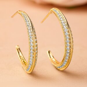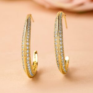 Earrings : Enhance your look with 22K gold-plated hoop earrings, adorned with sparkling cubic zirconia for a luxurious finish. Occasion : Bring your style to a whole new level with this handcrafted piece of jewelry. When you’re celebrating a special Occasion : – a birthday, festive, party or personal milestone – this piece adds that extra something that makes us feel special and looking our best. Material & Care Material :Brass Length : 2.5 cm, Width : 0.4 cm Weight : 4.22 gram Net Quantity : 1 Pair of Earrings Care Label : It is advisable to avoid contact with water and organic chemicals i.e. perfume sprays. Store jewellery in airtight box. After use, wipe the jewellery with soft cotton cloth.