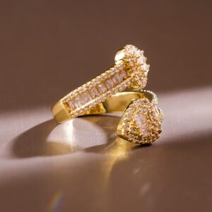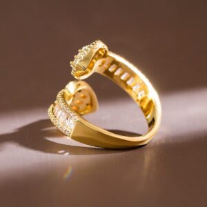 Ring : This 18k gold-plated adjustable ring features a sophisticated double buckle design, intricately studded with cubic zirconia, exuding modern elegance and a luxurious appeal. Occasion : Bring your style to a whole new level with this handcrafted piece of jewellery. When you’re celebrating a special Occasion : – a birthday, wedding, or personal milestone – this piece adds that extra something that makes us feel special and looking our best. Material : & Care Dimension : Net Weight: 4.74 g Net Quantity : 1 Ring Material :Brass Care Label : It is advisable to avoid contact with water and organic chemicals i.e. perfume sprays. Store jewellery in airtight box. After use, wipe the jewellery with soft cotton cloth.
