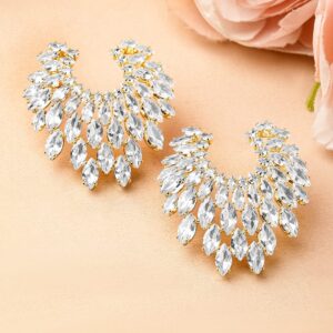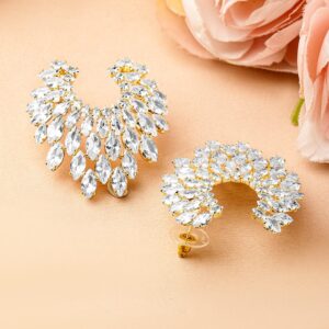 Earrings : Elegant 18K gold-plated earrings featuring fan-shaped cubic zirconia studded detailing. Perfect for elevating your style with a touch of luxury and sophistication. Occasion : Bring your style to a whole new level with this handcrafted piece of jewellery. When you’re celebrating a special Occasion : – a birthday, wedding, or personal milestone – this piece adds that extra something that makes us feel special and looking our best. Material : & Care Dimension : Length : 3.5 cm, Width: 2.4 w Net Weight: 14.83 g Net Quantity : 1 Pair Of Earrings Material :Brass Care Label : It is advisable to avoid contact with water and organic chemicals i.e. perfume sprays. Store jewellery in airtight box. After use, wipe the jewellery with soft cotton cloth.