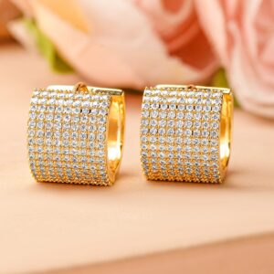 Earrings : Exude elegance with these 18K gold-plated hoop earrings, featuring intricate cubic zirconia detailing in a grid pattern. Perfect for adding a touch of luxury and charm to any outfit, these earrings are a must-have accessory. Occasion : Bring your style to a whole new level with this handcrafted piece of jewellery. When you’re celebrating a special Occasion : – a birthday, wedding, or personal milestone – this piece adds that extra something that makes us feel special and looking our best. Material : & Care Dimension : Length : 1.7 cm, Width: 1.4 w Net Weight: 11.4 g Net Quantity : 1 Pair Of Earrings Material :Brass Care Label : It is advisable to avoid contact with water and organic chemicals i.e. perfume sprays. Store jewellery in airtight box. After use, wipe the jewellery with soft cotton cloth.