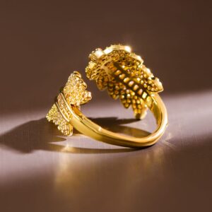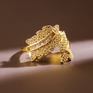 Ring : Enhance your elegance with this 18K gold-plated adjustable finger ring, featuring a leaf-inspired design adorned with pavé and baguette-cut cubic zirconia for a luxurious statement look. Occasion : Bring your style to a whole new level with this handcrafted piece of jewellery. When you’re celebrating a special Occasion : – a birthday, wedding, or personal milestone – this piece adds that extra something that makes us feel special and looking our best. Material : & Care Dimension : Size : 6 Net Weight: 5.21 g Net Quantity : 1Ring Material :Brass Care Label : It is advisable to avoid contact with water and organic chemicals i.e. perfume sprays. Store jewellery in airtight box. After use, wipe the jewellery with soft cotton cloth.