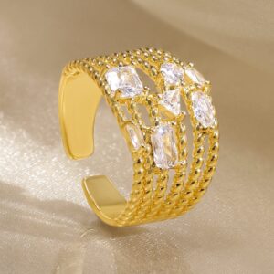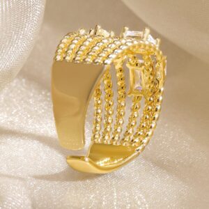 Ring : This 18K gold-plated adjustable ring features a mix of geometric Cubic Zirconia shapes set across bold textured bands, making it a luxurious and modern statement for festive or party looks. Perfect for Celebrations & Gifting: Whether worn for a festive occasion, party, or evening soiree, this standout ring enhances any look and also makes for a luxurious gift option. Material : & Care Dimension : Ring Size : Adjustable/Openable Ring Material : Brass Net Quantity : 1 Ring Net Weight : 4.1 Gram Care Label : It is advisable to avoid contact with water and organic chemicals i.e. perfume sprays. Store jewellery in airtight box. After use, wipe the jewellery with soft cotton cloth.