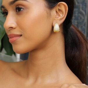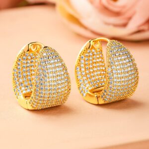 Earrings : Add a glamorous touch to your look with these 18K gold-plated hoop earrings, encrusted with shimmering cubic zirconia. Featuring a unique tapered design, these statement hoops radiate elegance and luxury. Occasion : Bring your style to a whole new level with this handcrafted piece of jewellery. When you’re celebrating a special Occasion : – a birthday, wedding, or personal milestone – this piece adds that extra something that makes us feel special and looking our best. Material : & Care Dimension : Length : 2.5 cm, Width: 1.5 w Net Weight: 16.86 g Net Quantity : 1 Pair Of Earrings Material :Brass Care Label : It is advisable to avoid contact with water and organic chemicals i.e. perfume sprays. Store jewellery in airtight box. After use, wipe the jewellery with soft cotton cloth.
