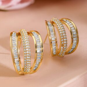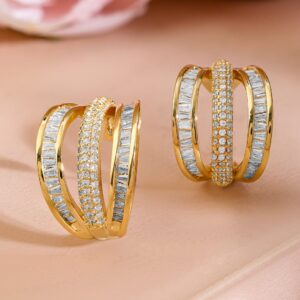 Earrings : Elevate your style with these 18K gold-plated hoop earrings featuring a stunning triple-band design adorned with cubic zirconia detailing for a radiant and elegant look. Occasion : Bring your style to a whole new level with this handcrafted piece of jewellery. When you’re celebrating a special Occasion : – a birthday, wedding, or personal milestone – this piece adds that extra something that makes us feel special and looking our best. Material : & Care Dimension : Length : 2 cm, Width: 1.7 w Net Weight: 12.50 g Net Quantity : 1 Pair Of Earrings Material :Brass Care Label : It is advisable to avoid contact with water and organic chemicals i.e. perfume sprays. Store jewellery in airtight box. After use, wipe the jewellery with soft cotton cloth.