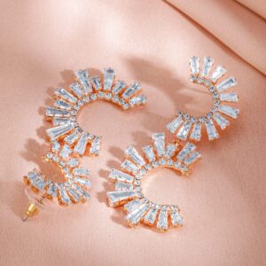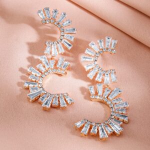 Earrings : These 18K Gold-Plated Curved Crystal Statement Drop Earrings showcase a striking curved design embellished with sparkling crystals. The 18K Gold-Plated finish adds a touch of luxury, creating a bold and elegant accessory for any special occasion. Occasion : Bring your style to a whole new level with this handcrafted piece of jewellery. When you’re celebrating a special Occasion : – a birthday, wedding, or personal milestone – this piece adds that extra something that makes us feel special and looking our best. Material : & Care Dimension : Length : 6 cm, Width: 2.2 cm Net Weight: 13.5g Net Quantity : 1 Pair Of Earrings Material :Brass Care Label : It is advisable to avoid contact with water and organic chemicals i.e. perfume sprays. Store jewellery in airtight box. After use, wipe the jewellery with soft cotton cloth.