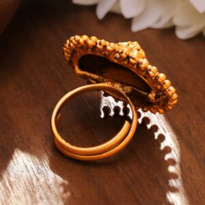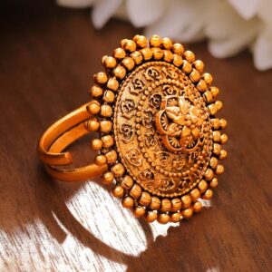 Ring: This 18K gold-plated adjustable ring showcases a beautifully dome-shaped floral design with intricate engraving and circular golden bead detailing, radiating traditional charm ideal for festive and ethnic styling. Perfect for Ethnic Looks: Whether paired with silk sarees, embroidered lehengas, or festive salwar suits, this traditional ring effortlessly enhances Indian outfits, ideal for weddings, festivals, and cultural occasions. Material : & Care Dimension :Size : Adjustable Material: Brass Net Weight: 9.12 Gram Net Quantity: 1 Ring Care Label: It is advisable to avoid contact with water and organic chemicals i.e. perfume sprays. Store jewellery in airtight box. After use, wipe the jewellery with soft cotton cloth.