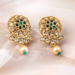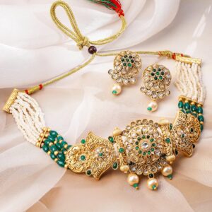This 18K gold-plated choker set features emerald green and white kundan stones, pearl accents, and vibrant green beads, making it a stunning choice for weddings, festive events, or special occasions. Material & Care Dimension : Length : Necklace: 14 cm; Earrings: 4 cm Width : Necklace: 5 cm; Earrings: 2.5 cm Plating : Gold Plated Material : Brass Net Weight : 59.08 Gram Net Quantity : 1 Choker & 1 Pair of Earrings Care Label : It is advisable to avoid contact with water and organic chemicals i.e. perfume sprays. Store jewellery in airtight box. After use, wipe the jewellery with soft cotton cloth.