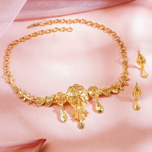 Jewellery Set : This 18K gold-plated brass choker set features a floral centerpiece with drop accents, leaf side detailing, and matching earrings—ideal for ethnic styling and medium festive occasions. Perfect for Ethnic Styling: Ideal for traditional occasions, pujas, and festive family functions, this choker pairs well with sarees, silk suits, or embroidered blouses. Material & Care Dimension : Length Size : Necklace : 10 cm, Earrings : 2 cm Dimension : Width : Necklace : 3 cm, Earrings : 1 cm Net Quantity : 1 Necklace & 1 Pair of Earrings Net Weight: 18.68 Gram Material : Brass Care Label : It is advisable to avoid contact with water and organic chemicals i.e. perfume sprays. Store jewellery in airtight box. After use, wipe the jewellery with soft cotton cloth.