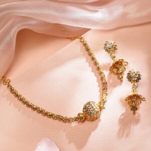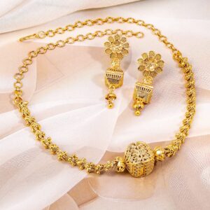 Jewellery Set : This 18K gold-plated brass necklace set features a filigree barrel-shaped centre bead, floral motif earrings, and intricate gold bead detailing—ideal for festive and traditional occasions for women & girls. Occasion : Bring your style to a whole new level with this handcrafted piece of jewelry. When you’re celebrating a weddings, festive occasions & traditional ceremonies, this piece adds that extra something that makes us feel special and looking our best. Material & Care Dimension : Length Size : Necklace : 30 cm, Earrings : 2.3 cm Dimension : Width : Necklace : 4.5 cm, Earrings : 2 cm Net Quantity : 1 Necklace & 1 Pair of Earrings Net Weight: 35.87 Gram Material : Brass Care Label : It is advisable to avoid contact with water and organic chemicals i.e. perfume sprays. Store jewellery in airtight box. After use, wipe the jewellery with soft cotton cloth.