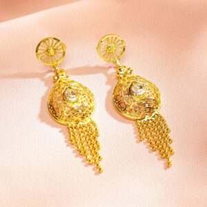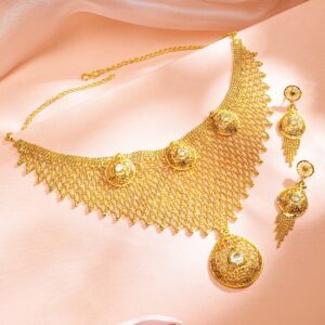 Jewellery Set : An 18K gold-plated handcrafted statement necklace set, featuring intricate filigree mesh design with dome-shaped motifs and fringe accents, paired with matching earrings. Perfect for weddings, festive occasions & grand celebrations. Occasion : Bring your style to a whole new level with this handcrafted piece of jewelry. When you’re celebrating a weddings, festive occasions & traditional ceremonies, this piece adds that extra something that makes us feel special and looking our best. Material & Care Dimension : Length Size : Necklace : 32 cm, Earrings : 3 cm Dimension : Width : Necklace : 4 cm, Earrings : 3 cm Net Quantity : 1 Necklace & 1 Pair of Earrings Net Weight: 42 g Material : Brass Care Label : It is advisable to avoid contact with water and organic chemicals i.e. perfume sprays. Store jewellery in airtight box. After use, wipe the jewellery with soft cotton cloth.
