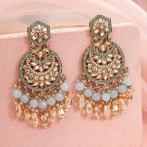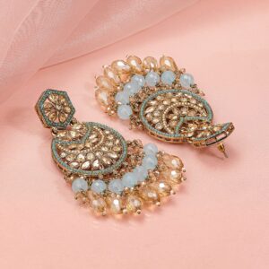 Exquisite 18K gold-plated kundan chandbali earrings adorned with sky blue stones and complemented by matching sky blue and light golden beads. A timeless piece to elevate any traditional attire. Material & Care Length : 10 cm ; Width : 4 cm Material : Brass Care Label : It is advisable to avoid contact with water and organic chemicals i.e. perfume sprays. Store jewellery in airtight box. After use, wipe the jewellery with soft cotton cloth.