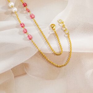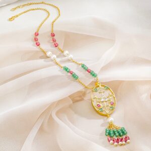 Necklace : This 18K gold-plated brass necklace features a white kundan-studded floral pendant with enamel detailing, green and pink beads, and pearls—perfect for ethnic wear and festive styling. Perfect for Ethnic Styling: Best suited for festive wear, traditional celebrations, or pujas, this piece elevates sarees, salwar suits, and embroidered ethnic outfits with elegance. Material & Care Dimension : Length : 33 cm ; Width : 2 cm Material: Brass Net Weight: 14 Gram Net Quantity: 1 Necklace Care Label: It is advisable to avoid contact with water and organic chemicals i.e. perfume sprays. Store jewellery in airtight box. After use, wipe the jewellery with soft cotton cloth.