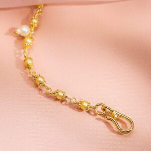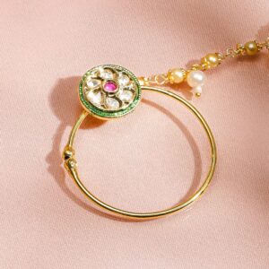 Nose Pin : This handcrafted nose ring features a kundan-studded floral motif with a ruby pink center and green enamel border, completed with a delicate chain adorned with pearl and gold beads. Cultural Grace & Gifting: A symbolic and stylish gift for brides or festive celebrations. This floral Nath brings timeless cultural grace to every traditional jewellery collection. Material & Care Dimension: Length: 8 cm ; Width: 1 cm Material: Brass Net Weight: 25 Gram Net Quantity: 1 Chain Nath Nosepin Care Label: It is advisable to avoid contact with water and organic chemicals i.e. perfume sprays. Store jewellery in airtight box. After use, wipe the jewellery with soft cotton cloth.