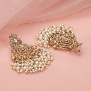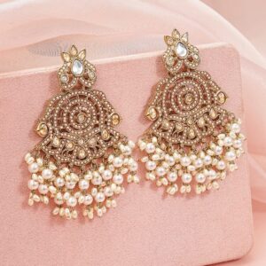 Elegant 18K gold-plated long chandbali earrings with intricate kundan work and dangling white glossy pearl beads. A perfect statement piece to elevate your traditional ensemble. Material & Care Length : 10 cm ; Width : 4 cm Material : Brass Care Label : It is advisable to avoid contact with water and organic chemicals i.e. perfume sprays. Store jewellery in airtight box. After use, wipe the jewellery with soft cotton cloth.