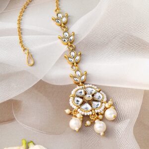 This exquisite 18K gold-plated maang tikka is meticulously designed with shimmering kundan stones, encircled by intricate craftsmanship. Adorned with lustrous pearl beads, this tikka exudes elegance and grace, perfect for enhancing your festive and traditional ensembles. Occasion : Bring your style to a whole new level with this handcrafted piece of jewellery. When you’re celebrating a special Occasion : – a birthday, wedding, festive or personal milestone – this piece adds that extra something that makes us feel special and looking our best. Material : Brass Care Label : It is advisable to avoid contact with water and organic chemicals i.e. perfume sprays. Store jewellery in airtight box. After use, wipe the jewellery with soft cotton cloth.