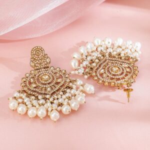 Earrings : Exquisite 18K gold-plated chandbali earrings adorned with Kundan stones and lustrous white pearl beads. The intricate handcrafted design adds a royal touch, making them ideal for festive & wedding occasions. Occasion : Bring your style to a whole new level with this handcrafted piece of jewellery. When you’re celebrating a special Occasion : – a birthday, wedding, or personal milestone – this piece adds that extra something that makes us feel special and looking our best. Material : & Care Dimension : Net Weight: 37.80 g Net Quantity : 1 Pair of Earrings Material :Brass Care Label : It is advisable to avoid contact with water and organic chemicals i.e. perfume sprays. Store jewellery in airtight box. After use, wipe the jewellery with soft cotton cloth.