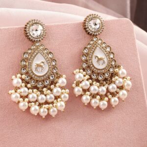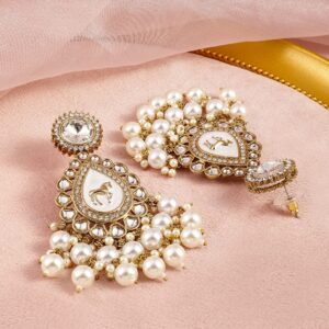 Earrings : Discover elegance with the Gold-Plated design, meticulously crafted for those who cherish luxury. This piece features precious stones for an eye-catching sparkle, making it perfect for special occasions. With a blend of high-quality materials and exquisite design, it promises both durability and style. The versatile look can complement a variety of outfits, adding a touch of sophistication. A must-have for enhancing your accessory collection with timeless elegance. Occasion : Bring your style to a whole new level with this handcrafted piece of jewellery. When you’re celebrating a special Occasion : – a birthday, wedding, or personal milestone – this piece adds that extra something that makes us feel special and looking our best. Material : & Care Dimension : Length : 8.5 cm, Width: 5 cm Material :Brass Weight : 37.7g Net Qnty : 1 Pair Earrings Care Label : It is advisable to avoid contact with water and organic chemicals i.e. perfume sprays. Store jewellery in airtight box. After use, wipe the jewellery with soft cotton cloth.