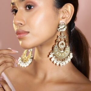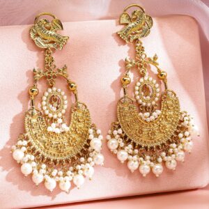 Statement Chandbali : These exquisite 18K gold-plated chandbali earrings showcase an intricate design paired with delicate white pearl beaded accents. The large, statement-making silhouette features detailed craftsmanship, including a beautiful bird motif at the top, adding a unique touch to these traditional earrings. Ideal for those who appreciate both elegance and artistic design in their jewelry collection. Occasion : Bring your style to a whole new level with this handcrafted piece of jewellery. When you’re celebrating a special Occasion : – a birthday, wedding, festive or personal milestone – this piece adds that extra something that makes us feel special and looking our best. Material & Care Dimension : Length : 12.3 cm Collection : Pearl & Beads Material: Brass Net Weight: 78.88 Gram Net Quantity: 1 Pair of Earrings Care Label: It is advisable to avoid contact with water and organic chemicals i.e. perfume sprays. Store jewellery in airtight box. After use, wipe the jewellery with soft cotton cloth.