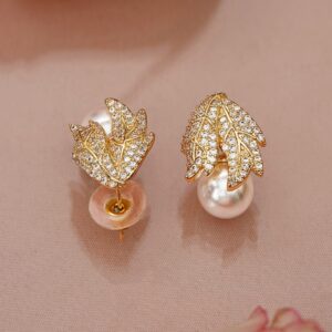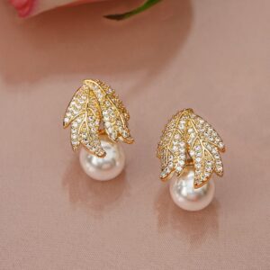 Earrings : These 18K Gold-plated earrings feature a sculpted leaf design encrusted with white cubic zirconia, paired with luminous white pearl drops for a refined elegant look. Ideal for graceful occasions. Styling Versatility: A perfect blend of nature-inspired artistry and sparkle, these earrings are ideal for special dinners, elegant functions, and formal occasions. They pair well with sarees, gowns, and Indo-western attire. Material : & Care Dimension : Length : 3 cm ; Width : 1 cm Net Weight : 20 Gram Material : Brass Net Quantity : 1 Pair of Earrings Care Label : It is advisable to avoid contact with water and organic chemicals i.e. perfume sprays. Store jewellery in airtight box. After use, wipe the jewellery with soft cotton cloth.