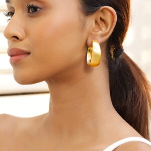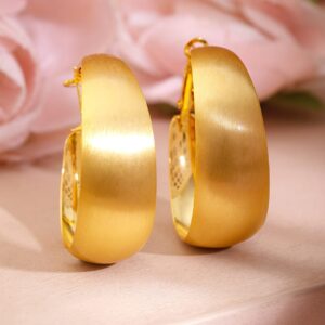 Earrings : Make a striking statement with these 18K gold-plated matte finish bold hoop earrings. Designed with a wide, smooth surface and a contemporary flair, these earrings add a touch of luxury to any outfit. Occasion : Bring your style to a whole new level with this handcrafted piece of jewellery. When you’re celebrating a special Occasion : – a birthday, wedding, or personal milestone – this piece adds that extra something that makes us feel special and looking our best. Material : & Care Dimension : Length : 3.5 cm, Width: 1.5 w Net Weight: 9.60 g Net Quantity : 1 Pair Of Earrings Material :Brass Care Label : It is advisable to avoid contact with water and organic chemicals i.e. perfume sprays. Store jewellery in airtight box. After use, wipe the jewellery with soft cotton cloth.