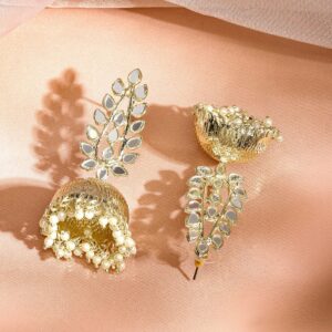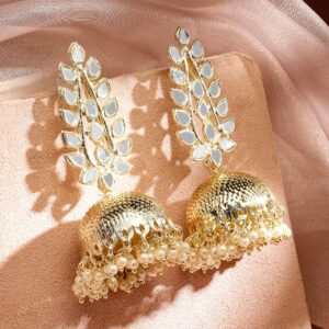 Elegant 18K gold plated traditional jhumka adorned with mirror studs and pearl beads. Perfectly crafted for a sophisticated and timeless look. Occasion : Bring your style to a whole new level with this handcrafted piece of jewellery. When you’re celebrating a special Occasion : – a birthday, wedding, festive or personal milestone – this piece adds that extra something that makes us feel special and looking our best. Material : & Care Dimension & Size : Length : 7 cm, Width : 3.5 cm Material : Brass Weight : 55g Net Qnty : 1 Pair Earrings